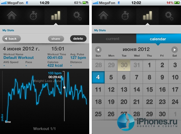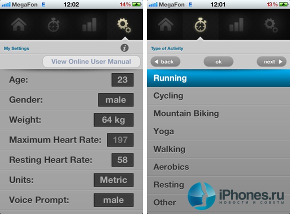 Для первичной настройки, после спаривания пульсометра со смартфоном, вам заботливо предложат установить бесплатное приложение. Там необходимо ввести некоторые данные о себе, такие как вес, рост, возраст и пол, а также выбрать тип тренировки. Исходя из этой информации приложение будет производить рассчеты и выводить на экран текущий пульс, график сердечных сокращений, время тренировки, количество сжигаемых калорий и «зону занятий», определяемую по вашей активности и превышению нормального уровня биений сердца. Переход между зонами сопровождается звуковыми сигналами, так что спортсмен может отслеживать свой пульс даже не смотря на экран смартфона. К сожалению, русской локализации разработчики не предусмотрели, но базового уровня знания английского языка вполне хватит, чтобы разобраться в премудростях настройки приложения.
