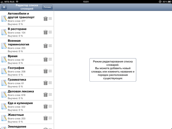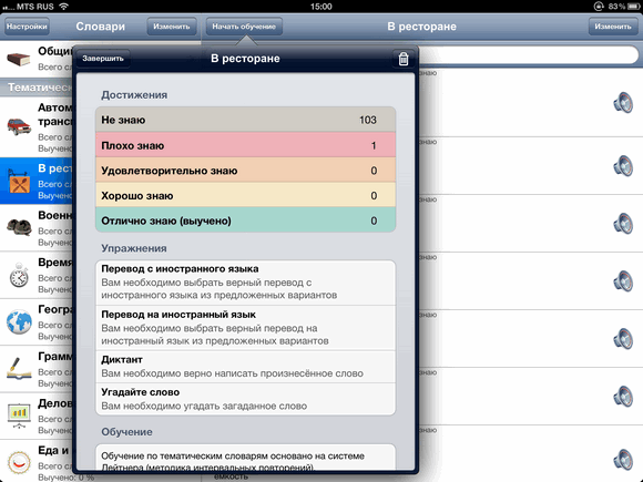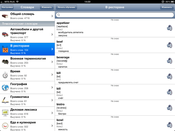 В программе предзагружены более 30 словарей на узкоспециализированную тематику, включая медицинские, сельскохозяйственные и военные термины. Есть и более «приземлённые» словари, вроде еды, цветов, растений и погоды. Всего аж 4716 английских слов, к каждому из которых прилагается транскрипция, перевод и озвучка. Можно просто копаться в них, выписывая незнакомые. Но нам предложен другой, гораздо более эффективный метод.
