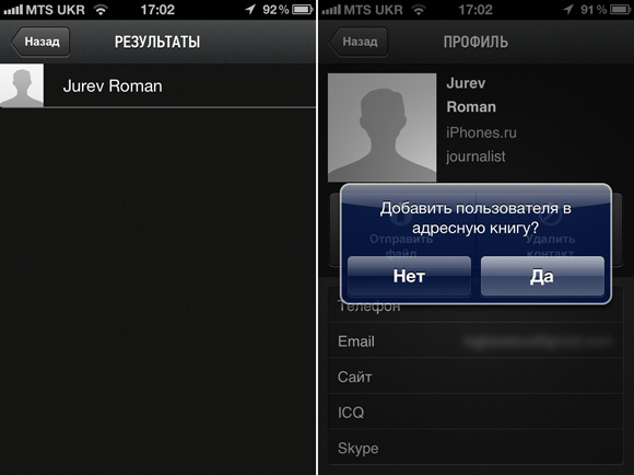 При одновременном нажатии на «+» на двух устройствах, происходит обращение к центральному серверу через интернет, который выделяет нужные нажатия. Остается только подтвердить контакт. При желании его можно добавить в адресную книгу телефона.