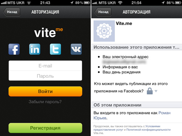 Полноценная же регистрация преодолевается за несколько секунд через учетную запись Facebook, Twitter, LinkedIn или же «ВКонтакте». Либо можно использовать собственную систему регистрации Vite.me, и в таком случае сразу формируется контактная карточка пользователя. При использовании упомянутых выше учетных записей ее можно отредактировать после регистрации.