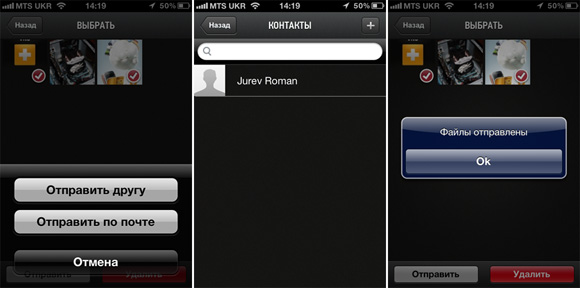 Отправлять файлы кому-то так же легко, как и обмениваться контактной информацией. Достаточно выбрать нужные изображения, видео или документы и адресата из списка друзей либо ввести электронный адрес для отправки ссылки на файл по почте.