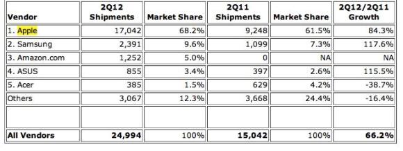 Всего за прошедший второй квартал Apple удалось реализовать 17 миллионов планшетов, отбив себе 68% рынка. В первом продажи составили 11,8 миллиона. Кстати, во втором квартале 2011 года показатель продаж iPad был немного больше 9 миллионов. Samsung держит второе место в списке лидеров рынка с 2,4 миллионами проданных девайсов. Год назад этот показатель был на уровне 1 миллиона, поэтому процент прироста у них выше, нежели у Apple. 117,6% против 84,3%. Замыкает тройку лидеров Amazon и его Kindle Fire с продажами 1,2 миллиона. ASUS и Acer занимают четвертое и пятое место в списке продавцов.
