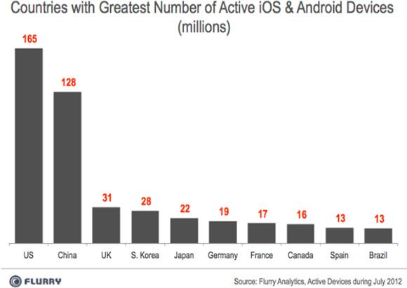 Аналитическая контора Flurry сравнивает бум операционных систем с интернет-бумом 90-х годов. Причём сравнивает не в пользу последнего, поскольку сейчас мобильные рынки в потребительском смысле показывают в два раза более заметный рост. Самый динамичный рынок — естественно, в Китае, о чём Apple любит напоминать при всяком удобном случае. За последний год рост по активированным iOS- и Android-устройствам в стране составил 400% с лишним, но даже этот рывок пока не позволил Поднебесной обогнать Штаты в численном исчислении. Американских девайсов — 165 миллионов, тогда как китайских — «лишь» 128. Россия не может похвастаться убедительными результирующими цифрами, зато — находится в восьмёрке наиболее быстрорастущих стран.