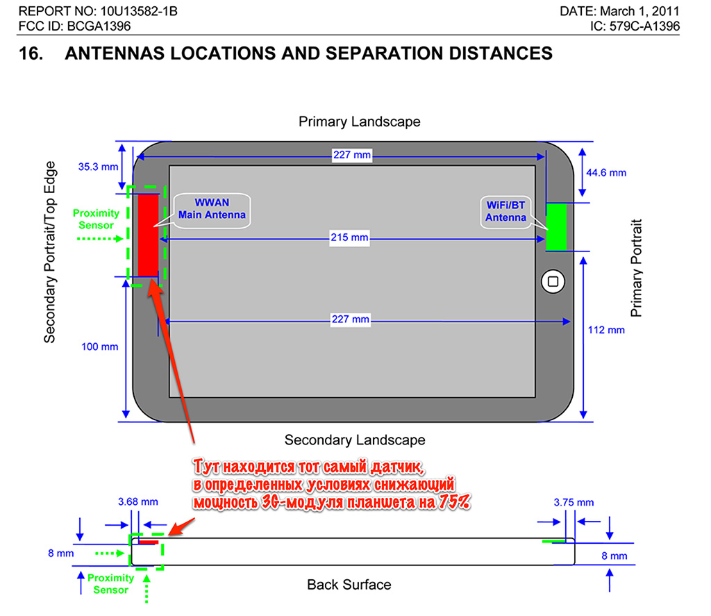 Конечно, сложно представить себе ситуацию, когда планшет будет находиться на расстоянии 10 мм от головы пользователя. Разве что гипотетическую — смотрел человек скучный фильм, сидя за столом над планшетом, да так и заснул, упав лицом прямо на антенну 3G-модуля, которая, судя по схеме выше, находится справа от камеры iPad 2 или нового iPad. Там же установлен и датчик, который тут же снизит мощность модема, обнаружив твердое тело, и, как результат, уменьшится уровень электромагнитного излучения.