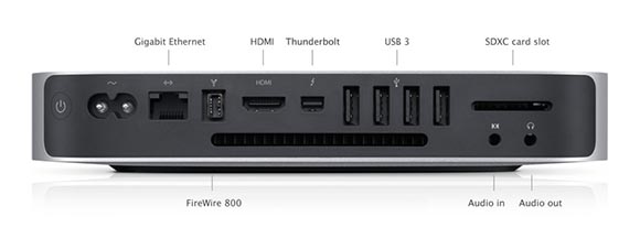 Новый Mac mini снабжен четырьмя портами USB 3, слотом для SDXC карт, портами Gigabit Ethernet, Thunderbolt, HDMI и FireWire 800.
