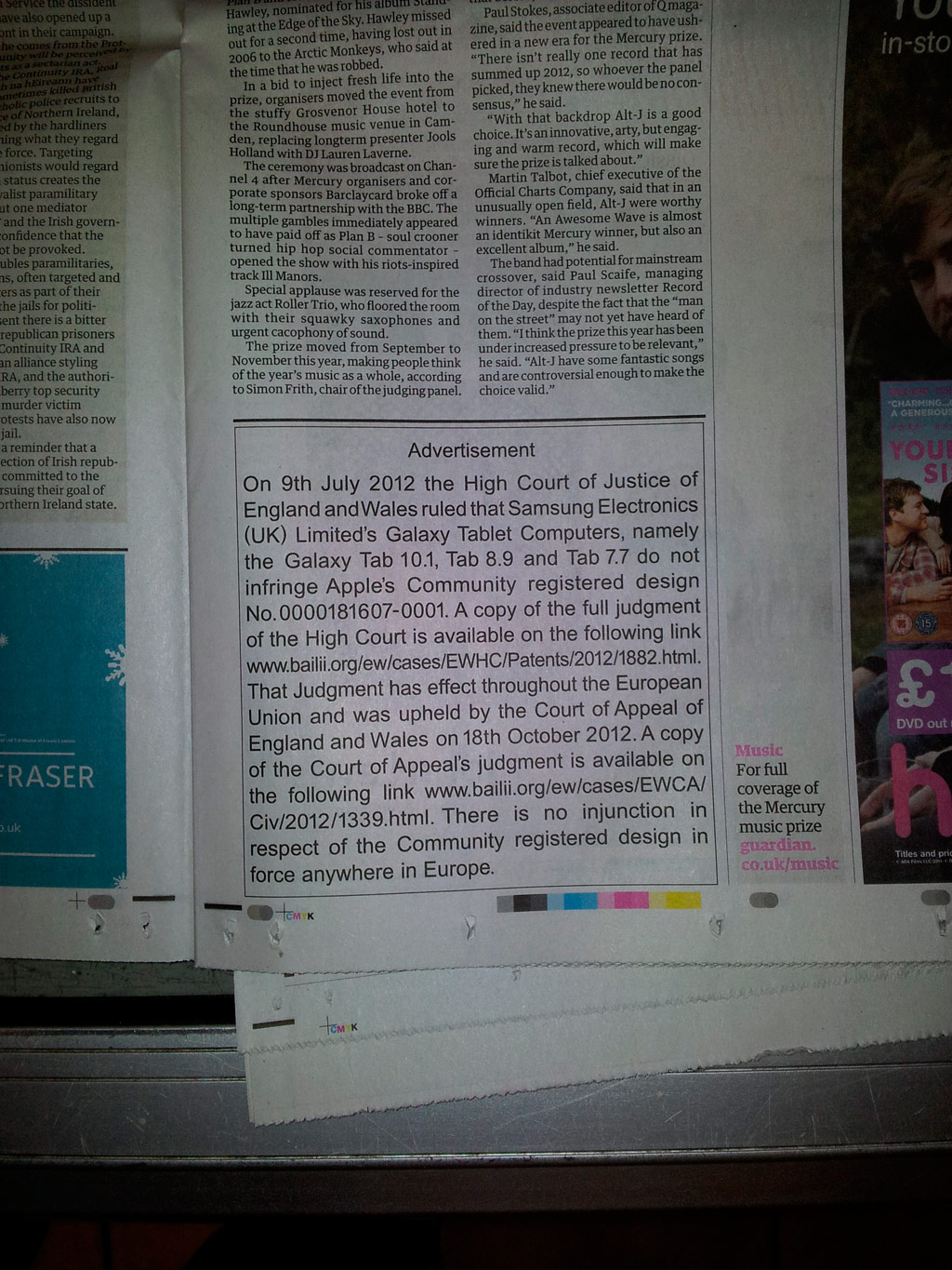 На данный момент ситуация такова: устрашившись гнева судей, Apple убрала текст про Samsung с сайта, но вместо него пока ничего не опубликовала. Зато суд, видимо, напомнил представителям компании, что пора бы и в газетах соответствующую рекламу пустить, как было сказано в вердикте. Британский филиал заплатил The Guardian за графический блок в печатном издании и разместил там текст — короткий, но всё равно пропитанный бюрократией: