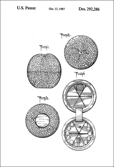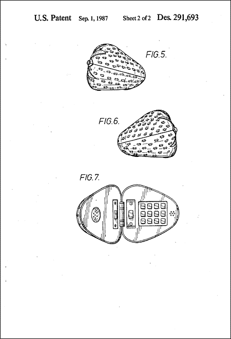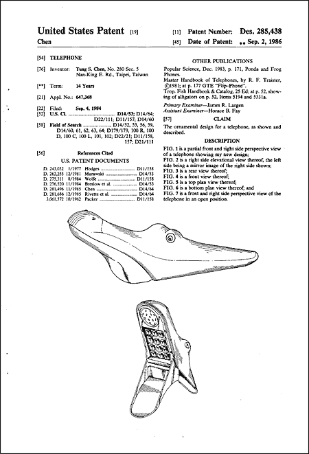 Сначала я подумал, что это очередной фейк. Но покопавшись в сети, нашел оригинальные сканы патента за номером D281686 от 10 декабря 1985 года.