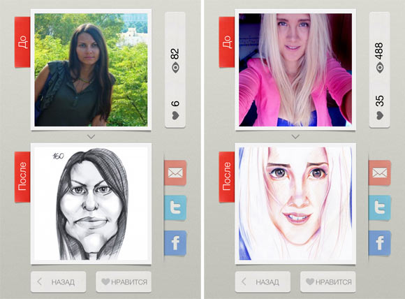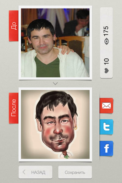 Карикатурой можно поделиться в твиттере, отправить в Фейсбук или по почте. Вот еще парочка моих заказов. Если найдете меня внутри приложения, плюсуйте :)