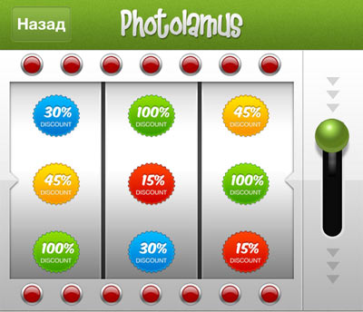 В программе также имеется «однорукий бандит» со скидками, на котором можно попытать счастья один раз в 24 часа. При совпадении полей на экране вы получаете дисконт на свой следующий заказ.