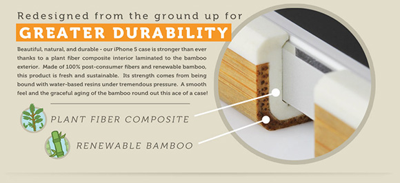 Традиционно, аксессуар выполнен из бамбука, только в варианте для iPhone 5 также используется некий композитный материал из растительного волокна. Из такого сделана внутренняя часть чехла.