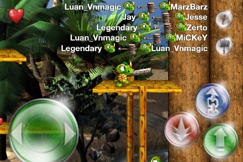 Прежде чем включаться в онлайн, рекомендую посмотреть обучающее видео, встроенное в саму игру. Но, с управлением сложностей возникнуть не должно. Виртуальный джойстик в левом углу экрана позволяет выбирать направление стрельбы или бега. А три кнопки в правом углу, выполняют функции прыжка, стрельбы и своеобразного крюка, который позволяет быстро перелетать с платформы на платформу.