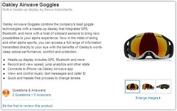 Знакомьтесь — Oakley Airwave Goggles. Это донельзя прокачанные защитные очки с массой функций для профессиональных сноубордистов и лыжников. Где-то внутри этой конструкции спрятан компьютер, измеряющий скорость движения, время, высоту, пройденную дистанцию, высоту и угол прыжков, а также направляющий пользователя в заранее заданные точки на карте, используя GPS. Вся информация выводится прямо на дисплей очков, а после заездов собирается в специальном приложении для iOS и Android, собирающем данные с аксессуара по Bluetooth. Project Glass отдыхает. Стоит всё это чудо 600 долларов без пяти центов.