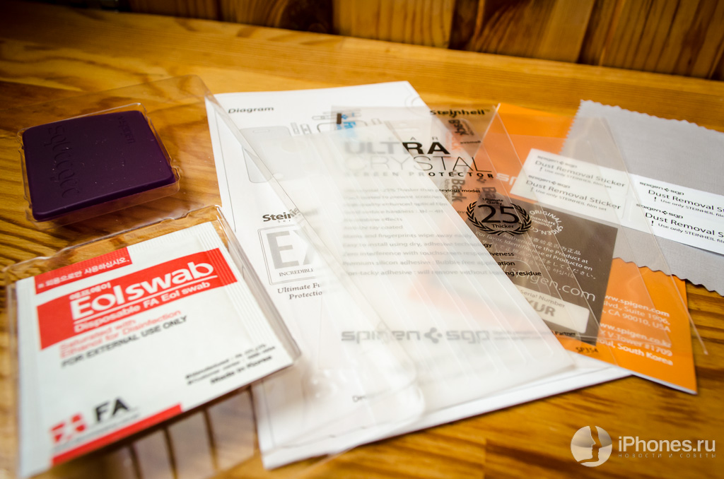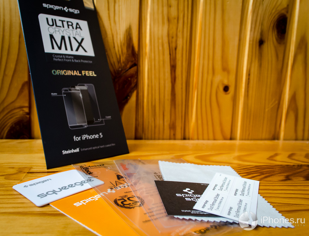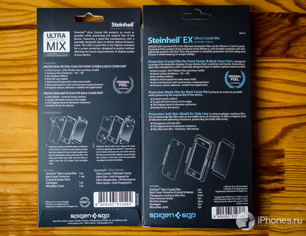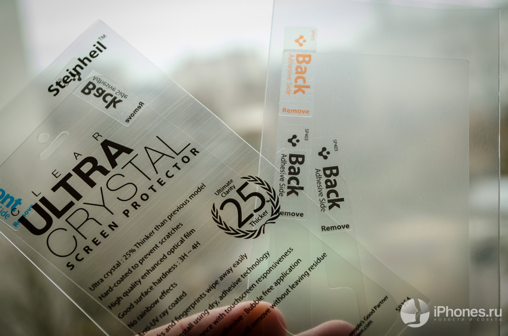 Попавшие мне в руки наборы Steinheil EX Ultra Crystal Mix и Steinheil Ultra Crystal Mix (Front & Back) для iPhone 5 очень похожи по функциональности и отличаются комплектом поставки, стоимостью и незначительно — уровнем защиты устройства. В первом пленок хватит на обклеивание смартфона со всех сторон и граней, во втором есть такие аксессуары только для передней и задней панели. А гибридными эти наборы я называю потому, что пленки в них обладают разными свойствами.