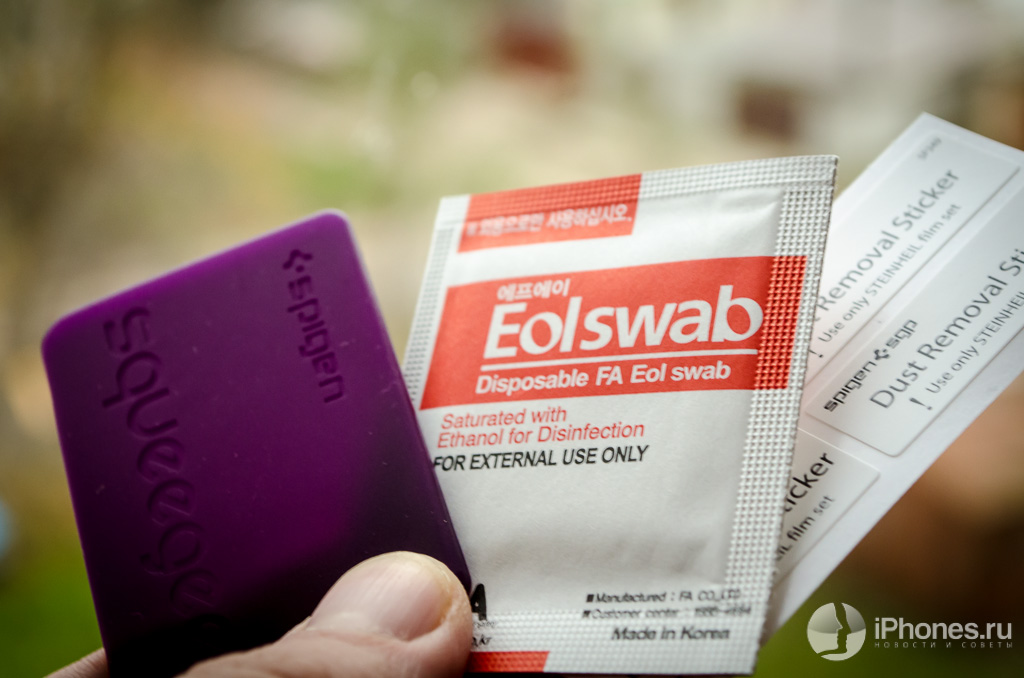 Резиновая карточка для разглаживания пленки, спиртовая салфетка и несколько полосок не оставляющего следов скотча, для извлечения пыли, если такая попадет под скринпротектор во время наклеивания