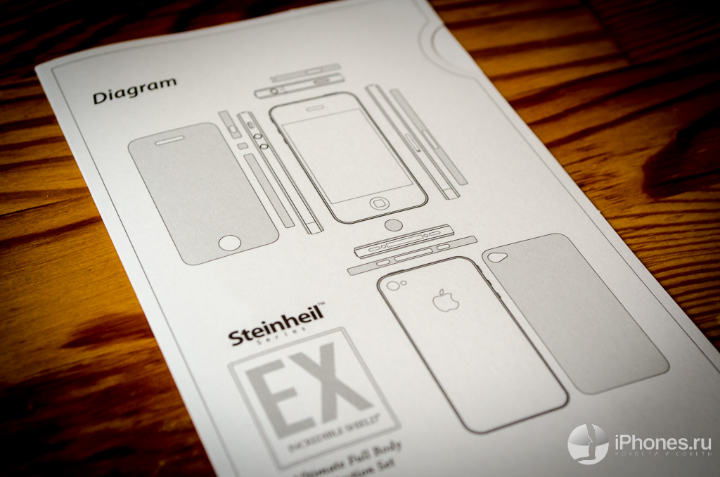 Думаю, самые внимательные заметили, что на схеме изображен iPhone 4/4S, в то время как набор для iPhone 5. Ну и ладно, осталась куча конвертов от старых комплектов, чего добру пропадать, вот только проблема в том, что план наклейки пленок на грань в iPhone 4/4S и в iPhone 5 сильно отличается. Помните, я попросил в начале статьи обратить внимание на заднюю часть коробки, так вот там напечатана правильная схема наклейки боковых пленок, используйте ее.