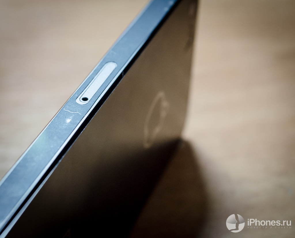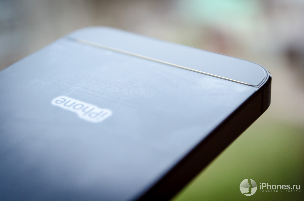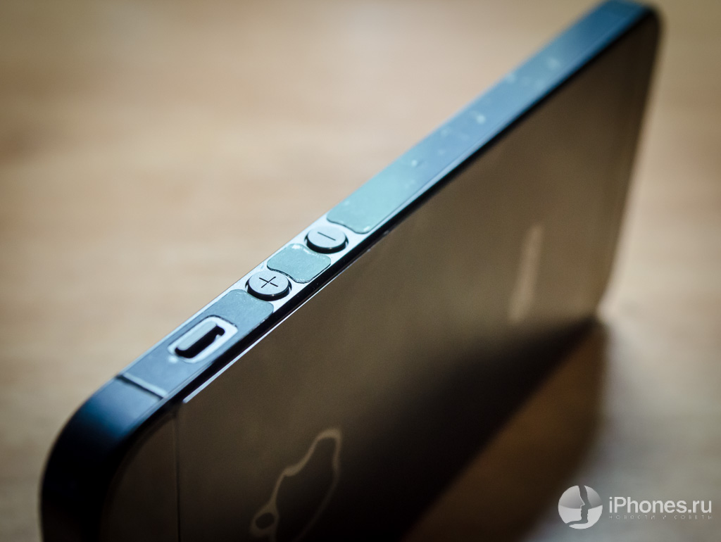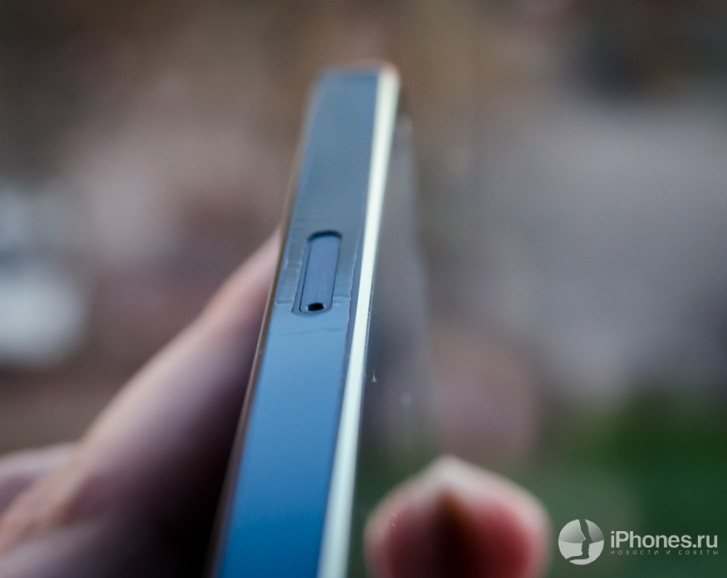Ориентироваться надо по отверстиям в пленках и по границам антенн на корпусе iPhone 5. Такая граница на правой грани сверху является основным ориентиром для обработки самых сложных участков. От нее вниз приклеиваем часть с вырезом под SIM-слот. Будьте очень аккуратны и осторожны, так как пленка легко растягивается. Именно из-за нее в комплекте лежит мягкая карточка для разглаживания, твердой пленку легко испортить. Приложите ее край сразу под разделителем и, чуть вытянув, примеривайтесь по грани, чтобы ровно приклеить и не закрыть слот. Если уж так случится, что пленка немного растянулась и прикрывает часть динамика или миниджека, то просто обрежьте ее там.