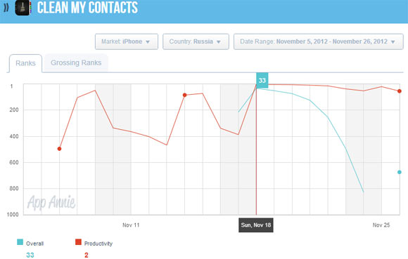 Получается, что плохие отзывы о предыдущей версии приложения практически не повлияли на количество скачек приложения. Покупатели в большинстве своем смотрят именно на позицию приложения в рейтинге AppStore.