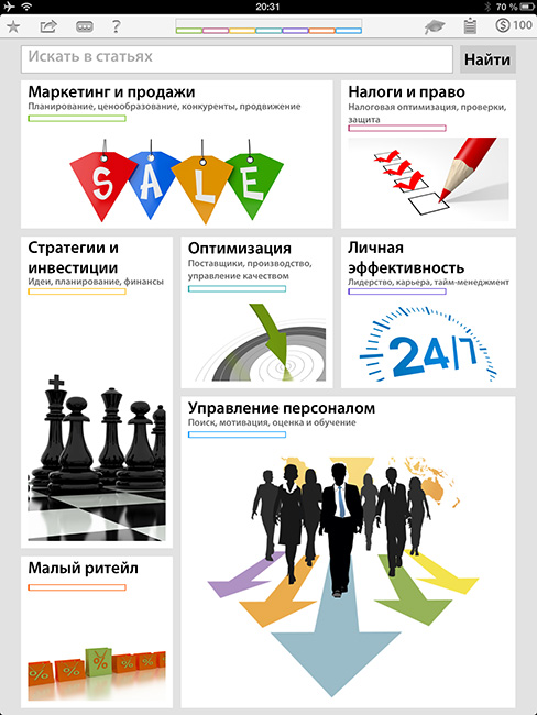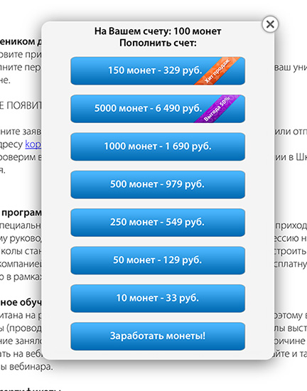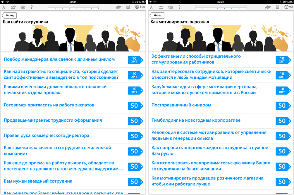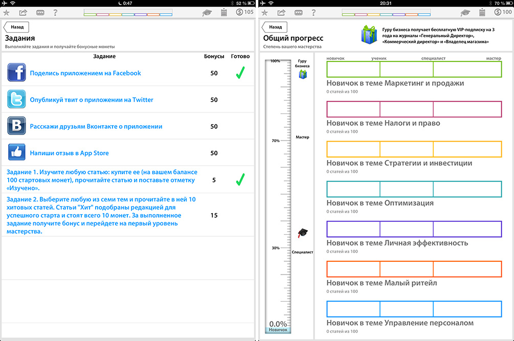 Во-вторых, в процессе обучения присутствует своего рода соревновательный или игровой элемент. Выполняя задания можно заработать монеты и повысить свой статус. При достижении определенного уровня пользователь получает возможность пройти удаленное обучение в «Школе бизнеса». Пользователей же, добившихся максимального уровня, компания обеспечит трехлетней подпиской на журналы «Генеральный Директор», «Коммерческий директор» и «Владелец магазина».