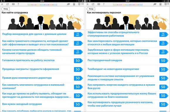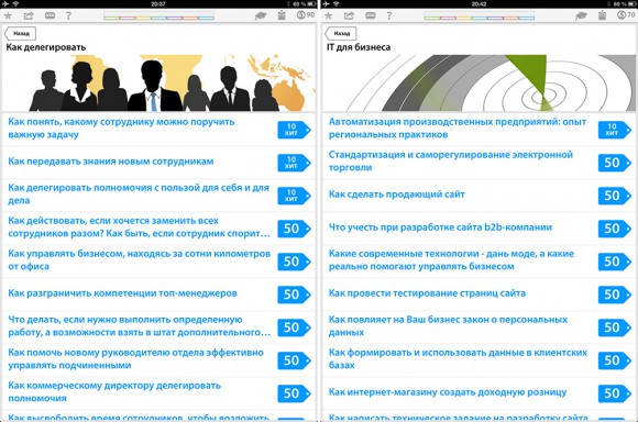 Глобальная идея приложения — познакомить более молодую аудиторию с журналами для руководителей: «Генеральный Директор», «Коммерческий директор» и «Владелец магазина», а также дать возможность читать статьи только на темы, которые интересны конкретному пользователю. Как показала практика, с задачей программа справляется, чему способствует удобная каталогизация материалов по разделам и темам.