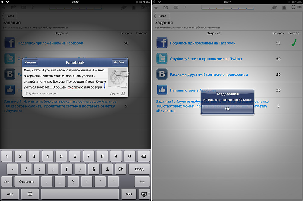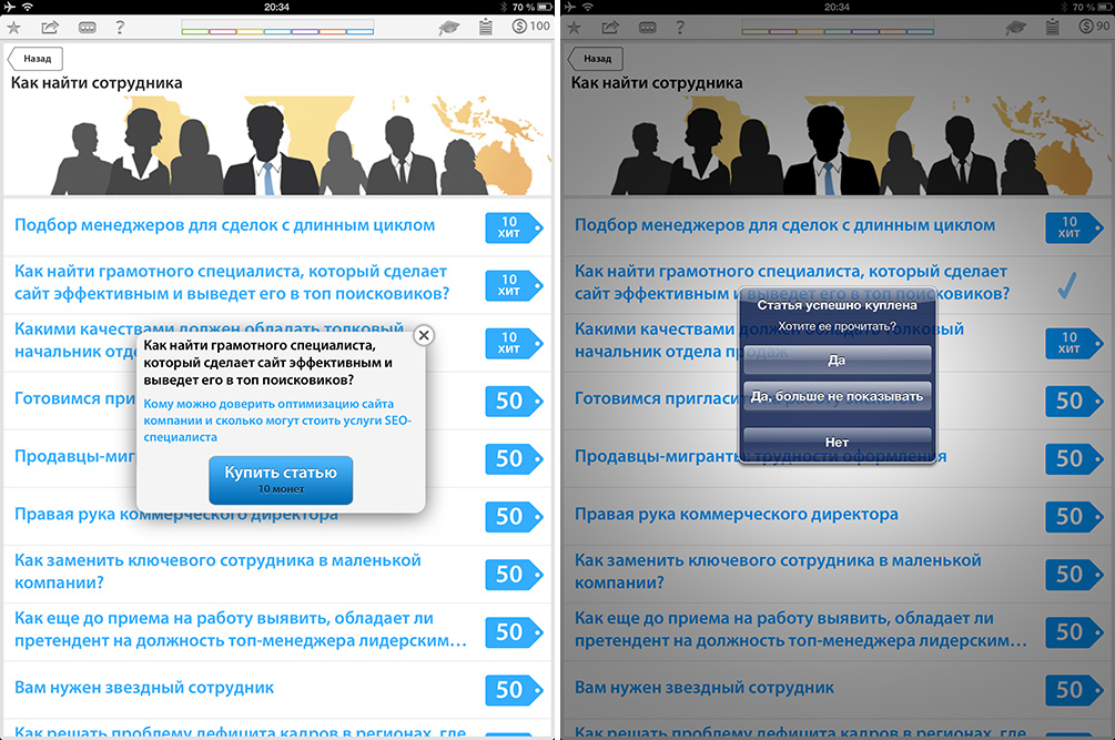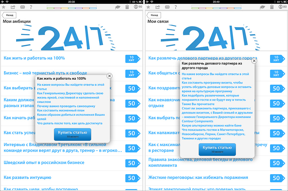Статьи приобретаются за монеты — это внутренняя валюта. Так называемые «Хиты» или базовые, основополагающие материалы, подобранные редакцией, стоят по 10 монет каждый, остальные — по 50. Для раскрутки пользователю дается сотня монет, рассказав о приложении в социальных сетях можно пополнить их запас, плюс за выполнение стандартных заданий тоже начисляются валюта, но не в столь большом количестве. Естественно, монеты можно купить за реальные деньги через In-App.