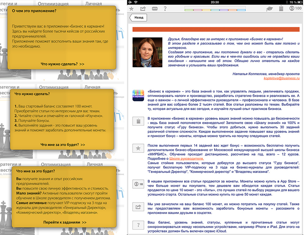 Кстати, при первом запуске приложения появляется удобная справка, рассказывающая о принципах работы программы. Кроме того, во вступительном слове менеджера проекта, Натальи Коптеловой, более детально раскрывается система работы с внутренней валютой.