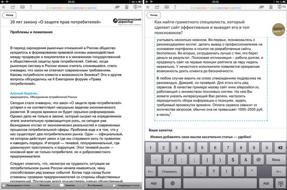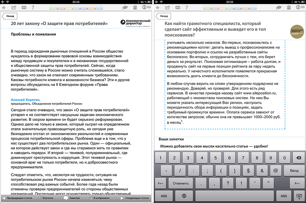 Сами статьи оформлены весьма неплохо, воспринимаются не хуже, чем в соответствующих журналах. При желании можно добавлять собственные заметки и мысли под каждым материалом. Жаль только, что нельзя выделять часть текста и сохранять эти кусочки в отдельном разделе, как это реализовано в электронных версиях журналов.