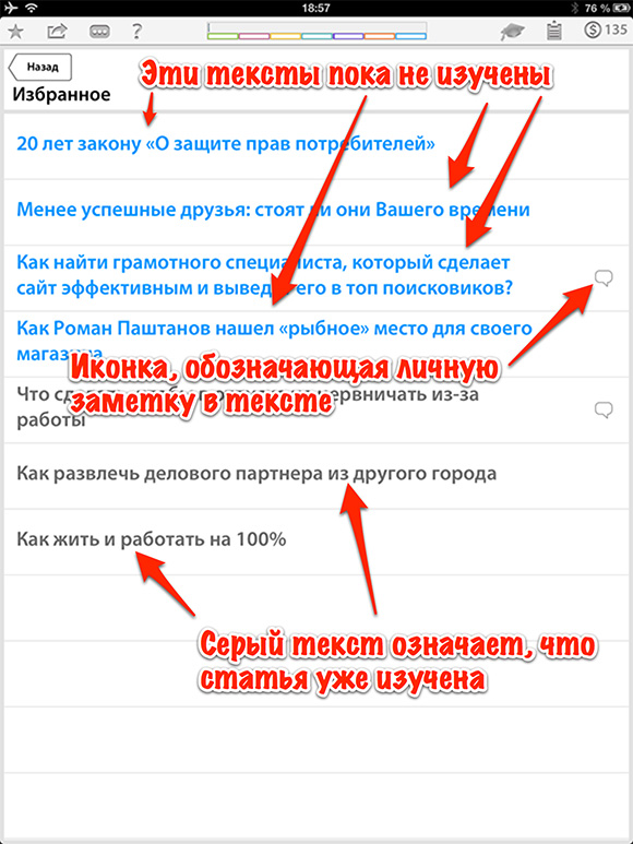 Кроме того, понравившиеся материалы можно добавить в раздел «Избранное» (клик по звездочке) и если в каких-то из них есть личные заметки, то это будет отображаться виде соответствующей иконки:
