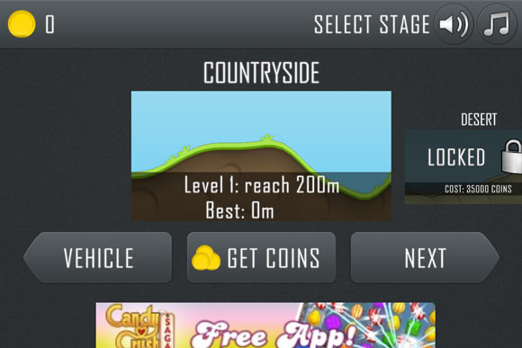 В Hill Climb Racing игрокам предлагается сесть за руль внедорожника и проехать довольно сложную дистанцию, собирая монеты и канистры с горючим. Теперь рассмотрим эту незатейливую на первый взгляд последовательность подробнее. Всего в игре четыре раздела, каждый со своим видом транспорта: джип, байк для мотокросса, джип-монстр и гоночная машина. Изначально доступен только первый автомобиль, остальные придется разблокировать за те самые монеты, собранные на трассах. Выбрав вид транспорта, переходим к выбору одной из восьми трасс. Здесь наблюдается похожая ситуация: открыта только первая – остальные за монеты.