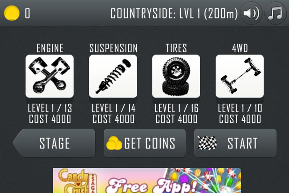 Выбираем трассу и видим четыре варианта “прокачки” своего железного коня. Можно улучшить двигатель, подвеску, шины и полный привод. Каждая деталь имеет свою стоимость, которая возрастает с каждым купленным уровнем. У всех улучшений максимальный уровень отличается. После того, как все приготовления выполнены и выбор сделан, можно начинать заезд.