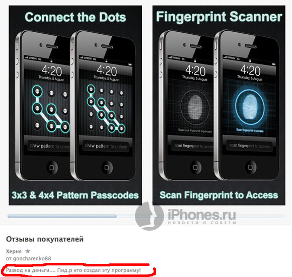 Больше половины пользователей iOS не знают границы допустимых способностей гаджетов Apple. Поэтому если видят на картинке, что программа на скриншотах представляет собой разблокировщик рабочего стола по отпечатку пальца, то покупают ее. И что в итоге?