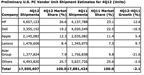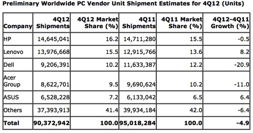 На мировом рынке HP также лидирует, однако старт Windows 8 не помог компании достичь прироста продаж. В итоге было отгружено на полпроцента меньше устройств, чем в прошлом году. Их общее количество составляет 14.6 миллионов. Lenovo на второй строчке с приростом в 8%.