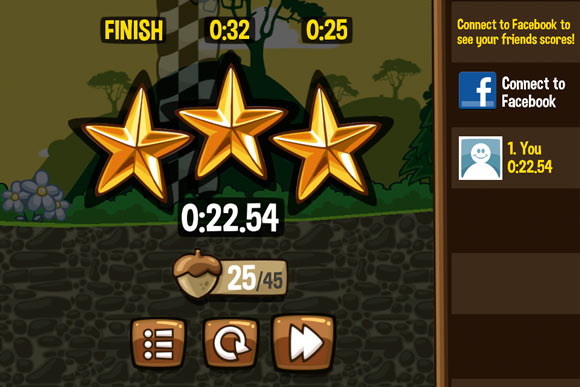 Игровой процесс, как уже говорилось выше, очень похож на Bad Piggies. Цель – добраться до конца уровня, собирая при этом желуди и монеты. Желудей на уровне ограниченное количество и их сбор влияет на итоговый результат, который оценивается знакомыми нам тремя звездами. Помимо желудей, на итоговый результат влияет затраченное на прохождение время. Монеты собираются для другой цели. Как и в игре от Rovio здесь есть встроенный конструктор, в котором можно изменять составные части нашей повозки с белками. Правда в Noble Nutlings нет необходимости изобретать что-то новое перед каждым уровнем. Здесь используется немного другой подход, когда собрав необходимую сумму монет, вы можете купить какую-нибудь деталь с лучшими характеристиками и установить ее на повозку.