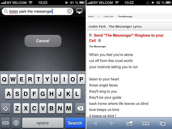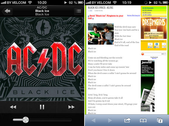 Теперь другой вариант использования. Для него вам не понадобится запускать iPod. Если вы сами знаете, для какой песни ищется текст, то можно просто ввести название исполнителя и песни в строку поиска. Дальше все произойдет аналогично первому сценарию. Теперь о втором минусе. Мне очень сложно понять логику разработчиков, которые отправляют пользователя из своего приложения в Safari. Это неудобно и только ведет к дополнительному расходу времени.