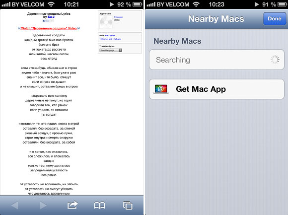 Теперь о совместной работе с версией для OS X. Этот режим тоже не представляет из себя чего-то выдающегося. Приложение ищет по Wi-Fi маки расположенные поблизости. После этого, если у вас на компьютере установлена отдельная версия Instalyrics (169 р.), то вы сможете найти текст песни, играющей, например, в iTunes. Полезно? Вряд ли.