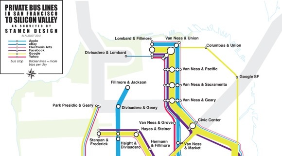 Корпоративными автобусами, которые занимаются развозкой сотрудников из дома на работу и обратно, сейчас никого не удивишь. В России и Украине эта распространенная практика для больших компаний, которая позволяет быстро доставить ценных сотрудников на свои рабочие места, да еще и поработать во время поездки. В американском городе Сан-Франциско, где расположена мекка IT-компаний Кремниевая долина, курсирует несколько неприметных автобусов белого цвета. Маршрут, по которому они развозят сотрудников компании, засекречен. Никто из жителей Сан-Франциско не знает, где останавливаются эти автобусы и как часто ходят. Интересными данными по поводу этих маршрутов поделилась дизайн-студия Stamen, которая в прошлом году получила грант на разработку арт-проекта с остановками общественного транспорта. Во время работы над заданием им удалось обнаружить нечто интересное: