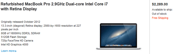 В разделе Refurbrished официального онлайн-магазина Apple сменились цены на 13-дюймовую модель MacBook Pro с дисплеем Retina. Речь идёт о всех стандартных модификациях плюс одна максимально «прокачанная»: так, модель с процессором Core i5 2,5 ГГц и 128 гигабайтами SSD-памяти обойдётся в 1439 долларов против 1699 за обычный вариант. Такой же ноутбук, но с двукратно увеличенной дисковой памятью стоит 1699 долларов вместо $1999.