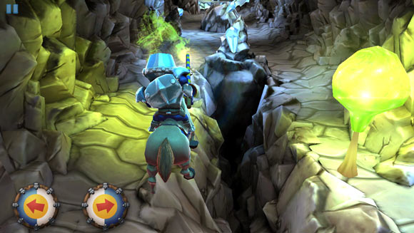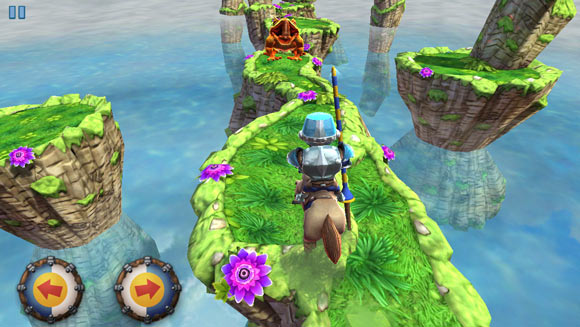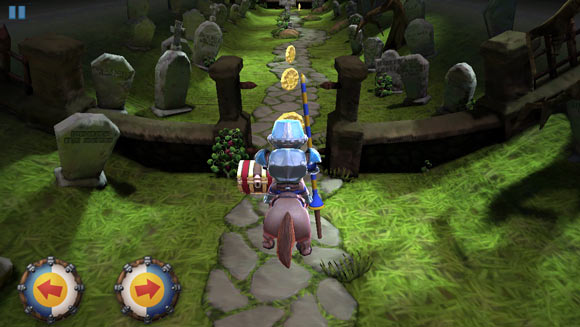 Перейдем к геймплею. Last Knight мало чем отличается от других представителей жанра, вроде Temple Run. В некоторых моментах даже выглядит проще. Например, здесь всего три действия: движение влево-вправо, прыжок и выставить копье. Какой же рыцарь без копья? Оно не раз выручит вояку в доспехах, когда нужно будет расчистить себе путь или одолеть врага. Да-да, вы не ослышались, в Last Knight есть враги и борьба с ними – один из самых необычных моментов в игровом процессе.