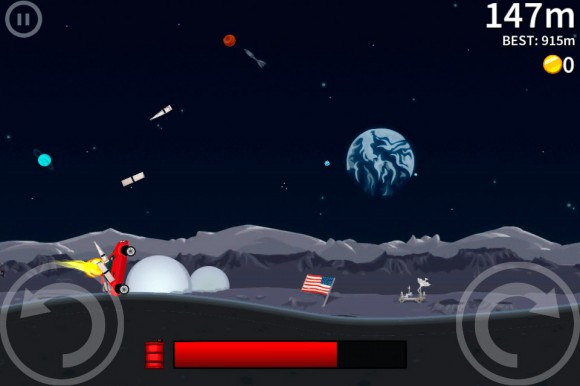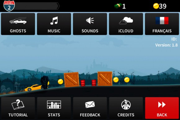 Опций немного. Они сводятся к работе со звуком и просмотру статистики. Чтобы понять общую суть игры, достаточно пролистать краткий туториал, который разъяснит куда и как нажимать, чтобы машина твердо держалась на дороге. На самом деле, управление сделано хорошо. Имеются две кнопки: правая поворачивает автомобиль по часовой стрелке, а левая — против. Нажатие на обе приводит к резкому приземлению. Вот, в общем-то, и все тонкости. На педаль газа вам давить не придется, машина сама будет нестись вперед.