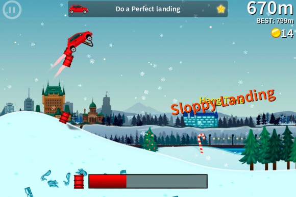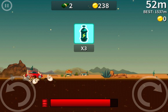 По правде говоря, кроме «декораций» уровни практически ничем не отличаются друг от друга. Мы мчимся по бесконечной трассе, попутно выписывая в воздухе кульбиты. За хорошо исполненные трюки начисляются бонусы. Разбиться очень легко, так что машину всегда нужно тщательно контролировать. Кроме того, всегда следите за уровнем бензина. Подобрав красные бочонки, которые встречаются по ходу следования, можно его пополнить. Пустой бак равносилен поражению. Попутно можно проходить мини-миссии, за выполнение которых вас ждет повышение ранга. Например, следует сделать десять кувырков за один заезд или собрать определенное количество монет. Чтобы разнообразить игровой процесс, разработчики ввели несколько забавных вещиц, однако даром они вам не достанутся.