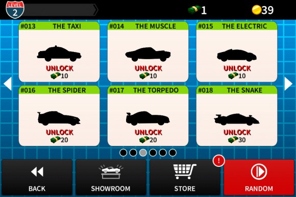 После нажатия на кнопку Play нам предлагают выбрать автомобиль, на котором мы будем лихачить. В игре 36 машин, но изначально доступна только одна, остальные разблокируются за игровую валюту. Если вы нетерпеливы и хотите заполучить все и сразу, то воспользуйтесь In-App Purchase. Разработчики с удовольствием предоставили такую возможность. Забегая вперед, хочу сказать, что каждого железного коня можно будет апгрейдить, и, да, тоже за монеты.
