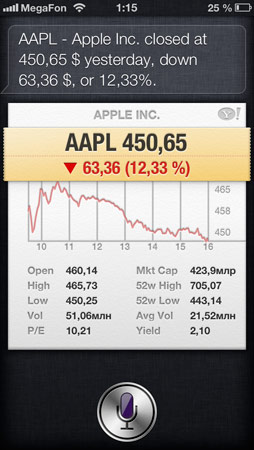 Apple традиционно созванивается с аналитиками сразу после закрытия бирж, а потому деятели рынка не имели возможности сходу отреагировать на итоги квартала. Впрочем, об их настроениях можно было легко судить по показателю внерыночных торгов «after hours». Вечером в среду одна ценная бумага AAPL обошлась бы вам в 514 долларов. Пресс-релиз послужил поводом отнять от суммы 5%, и то же самое можно сказать о пресс-конференции. Итого минус 10%, но — при закрытой бирже. Когда же она открылась, то… ситуация ничуть не улучшилась. Отправной точкой четверга стал рубеж в 460 долларов — разом минус 50 с лишним! — а к концу дня цена и вовсе просела до 450. Apple, если хотите, за сутки подешевела на десятки миллиардов: её капитализация ныне составляет 423 миллиарда, пусть даже нефтяная Exxon Mobil всё ещё ей уступает.