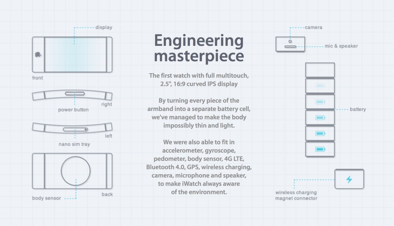 iWatch работают от нескольких мелких аккумуляторов, которые встроены в ремешок, благодаря чему часы получились очень тонкими. Apple, не нужно нам 128ГБ в iPhone, не нужна 13-мегапиксельная камера, дай нам iWatch. [justdesignthins.com]