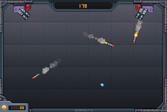 Геймплей будет понятен даже ребенку. Тапаем по алмазу и начинаем водить им по экрану, увиливая от выстрелов, самонаводящихся ракет и прочей взрывающейся ерунды. Уже через пару минут (не факт, что вы продержитесь, кстати) появится первый босс. Из его железного корпуса, на котором и находится уязвимое место, куда нужно бить алмазом, будут постоянно вылетать мелкие супостаты и сновать за вами. Тут вы и сможете проверить ловкость своих пальцев. Я бы, правда, сделал бы алмаз чуть большим в размерах, так как под пальцем его не видно. На iPad играть было бы удобнее, но версии для планшетника нет. Как, собственно, и для iPhone 5. Это главный минус игры.