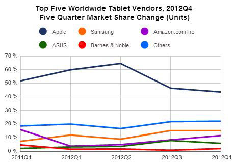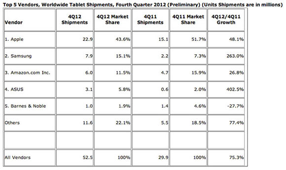 Высокий спрос праздничного периода остался позади вместе с праздниками. Компании уже успели подвести итоги ударного квартала и отчитаться об успехах. Аналитики, в свою очередь, смогли еще раз пересчитать все как следует и составить рейтинг с изменившимися рыночными долями. У iPad все хорошо, но темпы роста Samsung настораживают.