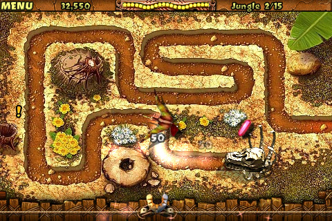 Однако ближе к делу. В Stoneloops! of Jurassica игрокам предстоит в основном стрелять красными шарами по скоплениям красных же шаров, синими – по синим и так далее. Удачные попадания выбивают из поделенной на шары ползучей змеи звенья. Все, надеюсь, играли в Zuma и Stoneloops! на компьютере? В общем, принцип тот же. По ходу пьесы собираем камушки, на которые в будущем отстраиваем свое небольшое поселение.