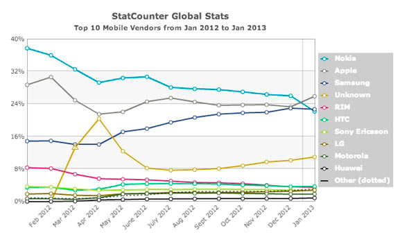 Исследование, проведенное авторитетным агентством StatCounter, показало, что в январе Apple впервые обошла Nokia по мобильному веб-трафику. Заслуга в этом достижении не принадлежит целиком Apple. Более явной причиной потери позиций Nokia является затяжной кризис, в котором пребывает некогда крупнейший производитель мобильных телефонов и смартфонов. Nokia умудрилась за год растерять более 15% в рассматриваемом компоненте. Важно отметить, что успех iOS в данном рейтинге полностью основывается на iPhone, поскольку планшеты были из него исключены.