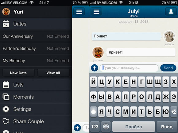 Главный экран представляет собой окно беседы, где внизу расположены различные опции для общения, а клавиша в верхнем левом углу позволяет вызвать меню, содержащее еще пару функций. Начнем с последнего. В меню можно ввести даты годовщины, дня рождения партнера и собственного. Вероятно, на случай, если вы его забудете. Далее в меню присутствует простейший список вещей, в который можно заносить покупки или подарки. Следующий пункт называется «моменты». Там сохраняются все фотографии и видеозаписи, а также рисунки, которыми вы обменивались со своей половинкой в чате. Также в меню есть настройки и средства для того, чтобы поделиться информацией о своей паре в социальных сетях.