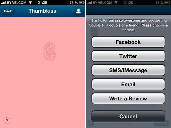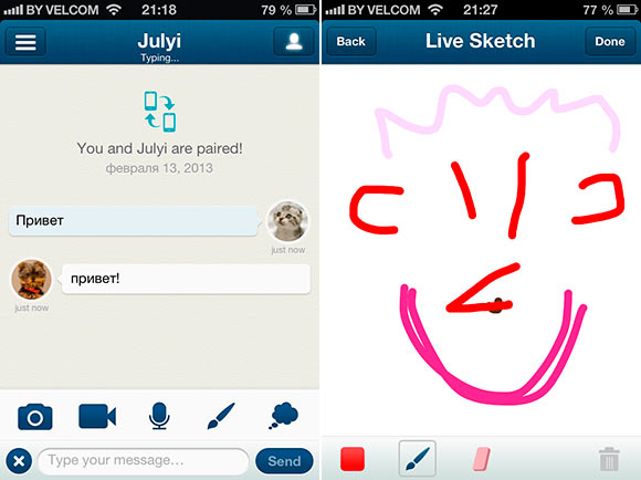 Теперь рассмотрим возможности беседы. Помимо обычной текстовой переписки, в Couple можно делать еще несколько интересных вещей. Присутствует довольно традиционные возможности отправки фото, видео или голосового сообщения. Прямо из мессенджера можно позвонить по Face Time или отправить своей половинке текущее местоположение. Наверное, полезно в острых случаях ревности. Еще в Couple можно нарисовать простенький рисунок и сразу же его отправить. Можно также рисовать одновременно на одном холсте. Присутствует интересный способ напомнить о себе. Нажимаем на значок облака и партнеру отправляется напоминание, что вы думаете о нем. И, наконец, присутствует небольшое развлечение, когда необходимо сопоставить два отпечатка. Каждый удерживает палец на экране своего устройства и при совпадении устройство будет вибрировать.
