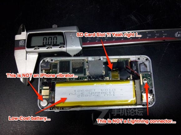 Обновлено: На фотографии ниже отмечены четыре основных признака, говорящих нам о том, что это устройство определенно не iPhone 5S, а эти снимки всего лишь неудачная шутка.