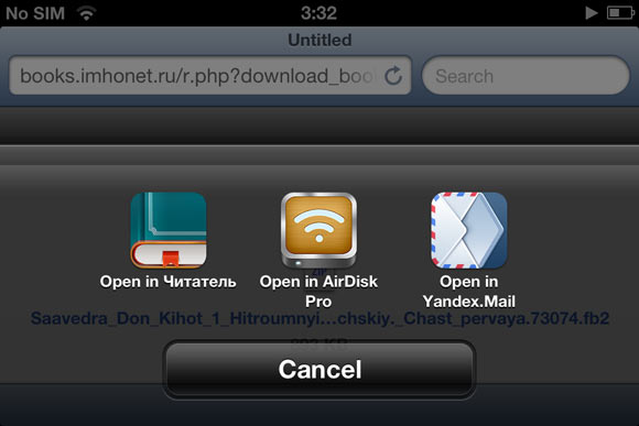 Первым делом следует напомнить некоторые реалии книжных приложений в App Store. Перед всеми книжными приложениями, кроме iBooks, родного приложения Apple, стоит проблема загрузки книг в приложение. Признаемся, через iTunes загружать документы в приложение неудобно… С некоторых пор, в мобильной Safari появилась возможность, кликнув по ссылке книжного файла, открыть этот файл в предлагаемой программе. «Открыть в…». Но об этой возможности многие пользователи не знают.